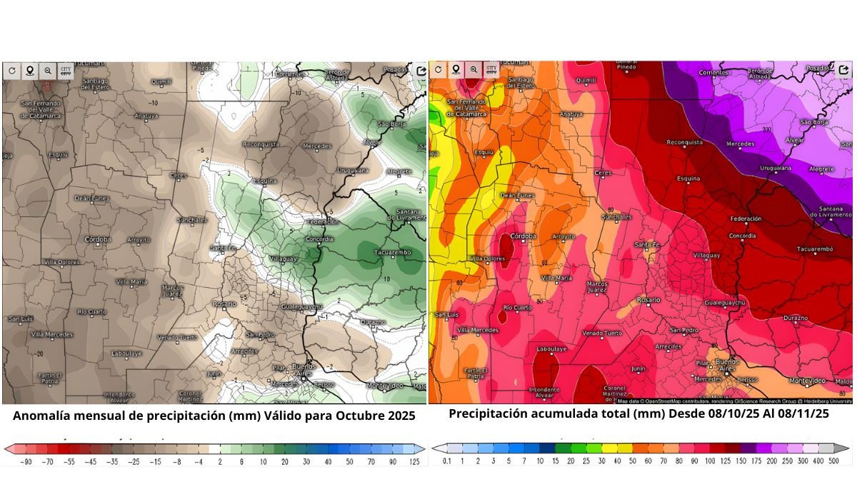 Los acumulados mensuales se mantendrían cerca de los valores históricos, considerando que las lluvias típicas de la primavera son mayores. No obstante, en la capital provincial -por ejemplo- se estiman entre 40 y 50 milímetros para octubre, frente a un promedio de 90 milímetros.