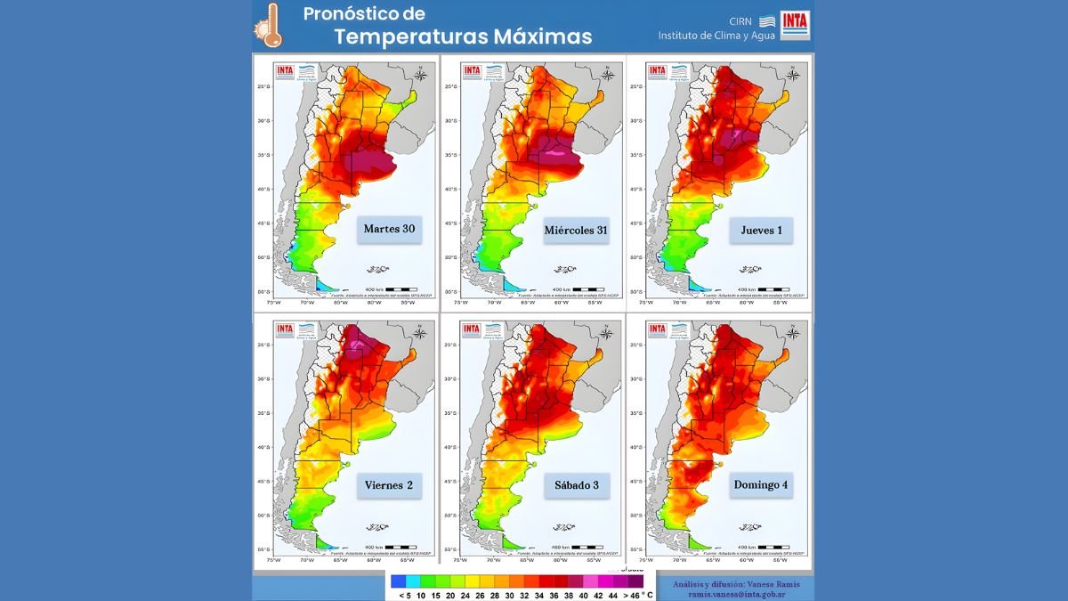 El pronóstico de temperaturas máximas difundido por el INTA refuerza estas advertencias. Los mapas muestran un escenario persistente de calor intenso en gran parte del territorio nacional, con valores elevados durante varios días consecutivos, lo que incrementa el riesgo de estrés térmico acumulado.