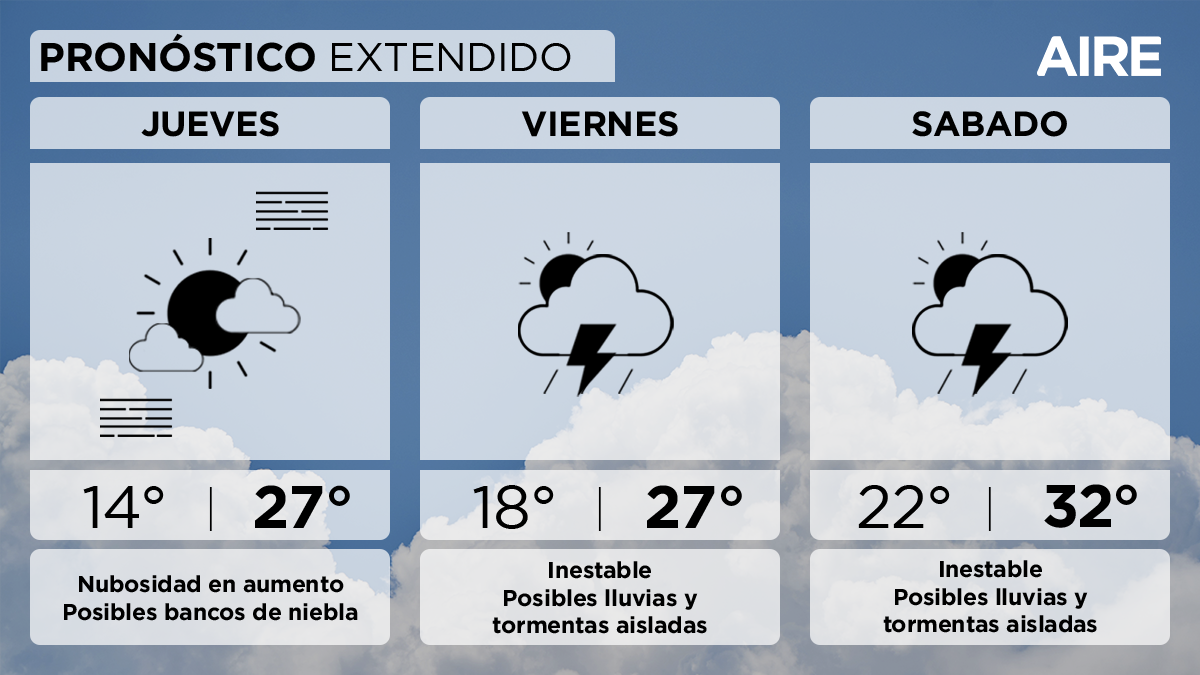 - El viernes las condiciones serán inestables, con posibles lluvias y tormentas aisladas. Temperatura mínima de 18°, máxima de 27° y viento leve a moderado del sudeste.