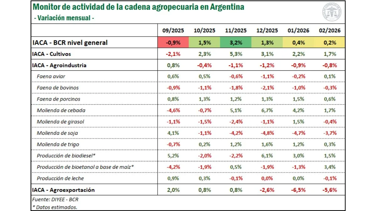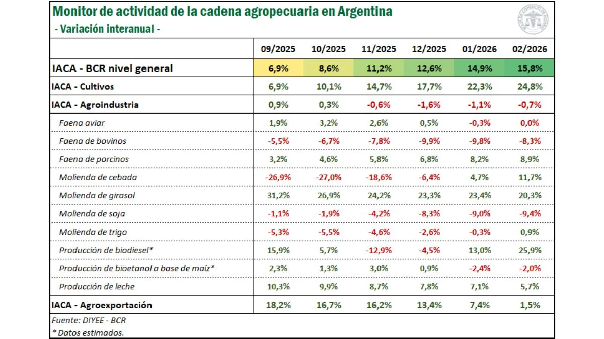 El IACA-BCR subió 0,2% mensual en febrero y acumuló un alza interanual del 15,8%, con mejoras en siete de sus doce componentes. El avance de la producción primaria —cercano al 25% anual— contrastó con caídas en exportaciones (-5,6%) y en la actividad agroindustrial.