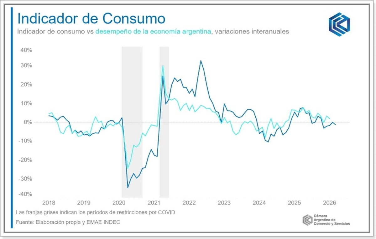 Históricamente, el consumo y la actividad económica se movieron en la misma dirección. Sin embargo, en 2026 aparece una señal de quiebre.