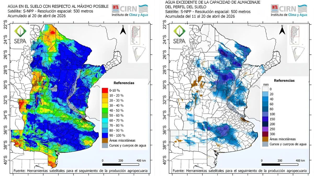 Humedad del suelo respecto del máximo posible al 20 de abril (izquierda) y los excedentes respecto de la capacidad de almacenaje (derecha).