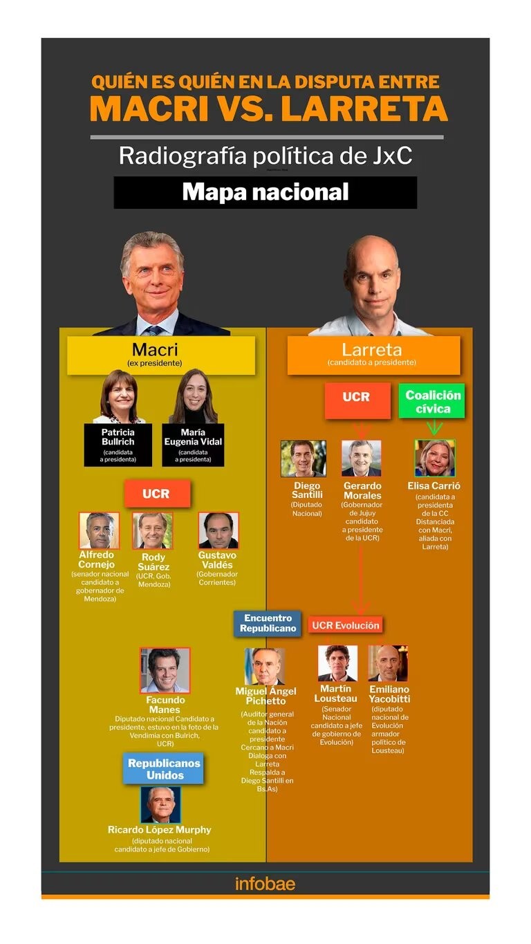 El ala del radicalismo alineada con Rodríguez Larreta lo encabezan el senador Martín Lousteau, líder de Evolución radical, y el gobernador de Jujuy, Gerardo Morales. El jujeño es el presidente del Comité Nacional. Desde allí, moviliza estructuras que mantienen sintonía con el larretismo. Pese a la sintonía del jefe de Gobierno con Lousteau y Emiliano Yacobitti, armador político de Evolución, hay dirigentes de ese espacio como Rodrigo De Loredo que también tienen un buen vínculo con Macri y Bullrich.