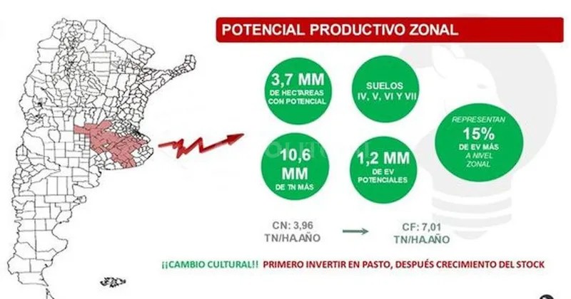 A título de ejemplo, en un trabajo realizado por su consultora, sobre 35 departamentos/partidos de las provincias de Buenos Aires, Santa Fe y Córdoba, se determinó a través de la información disponible que hay 11 millones de has ganaderas, y tomando dentro de esa área los suelos IV,V,VI y VII, o sea suelos no agrícolas, por la información evaluada se podrían sembrar 3,7 millones de has de pasturas cultivadas produciendo un 77%, en una región que esta el 31% del rodeo nacional. Los resultados del estudio permiten proyectar que pueden producirse 10,6 millones de tn más de materia seca que implicaría un incremento de 1,2 millones de equivalentes vacas mas o sea un 15% mas de la carga actual. Este tipo de trabajos de ambientación y estudio del potencial productivo a través del cambio de la realidad actual es posible hacerlo para un campo, y de esa manera ajustar su producción al máximo posible, la tecnología está disponible y es de uso habitual para quienes estamos trabajando en modificar las realidades de la producción y uso del pasto.