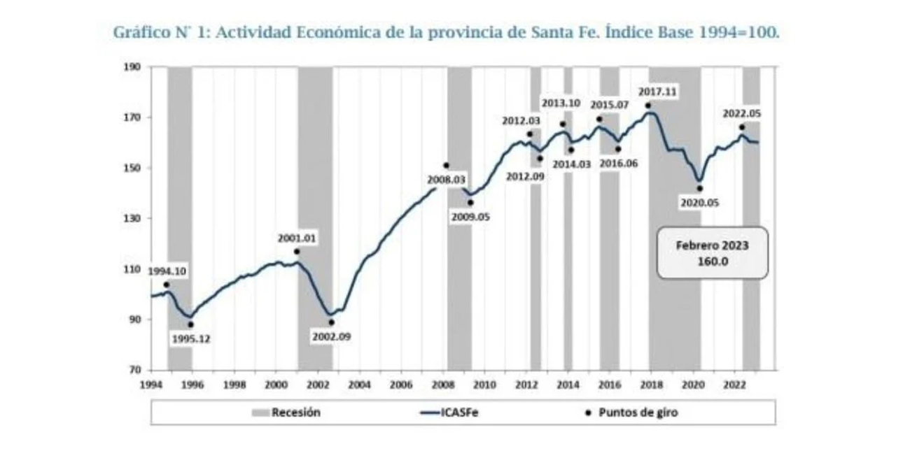 "Con datos a febrero de 2023 la variación interanual del ICASFe sigue dando cuenta del estancamiento de la actividad económica provincial durante el último año, registrándose una tasa del -0,2% con respecto a igual mes de 2022. En los últimos once años la economía provincial ha registrado cinco fases recesivas, y cuatro fases expansivas.