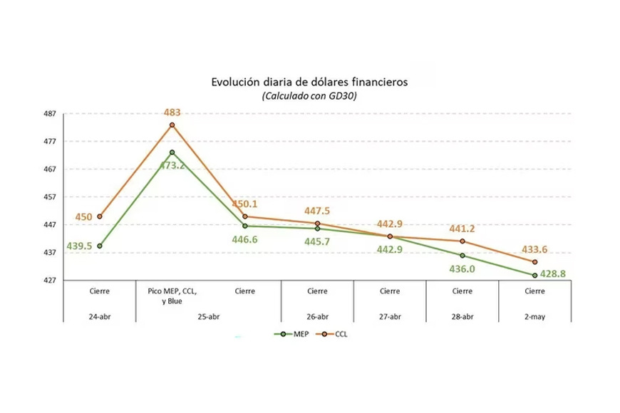 El “contado con liquidación” -que tocó los $422- se pactó al cierre a $433,64 según datos de Reuters, y el dólar MEP alcanzó los 428,84 pesos. Esto significó una caída en un rango de los siete a ocho pesos para estas cotizaciones, en la quinta rueda consecutiva con tendencia bajista.