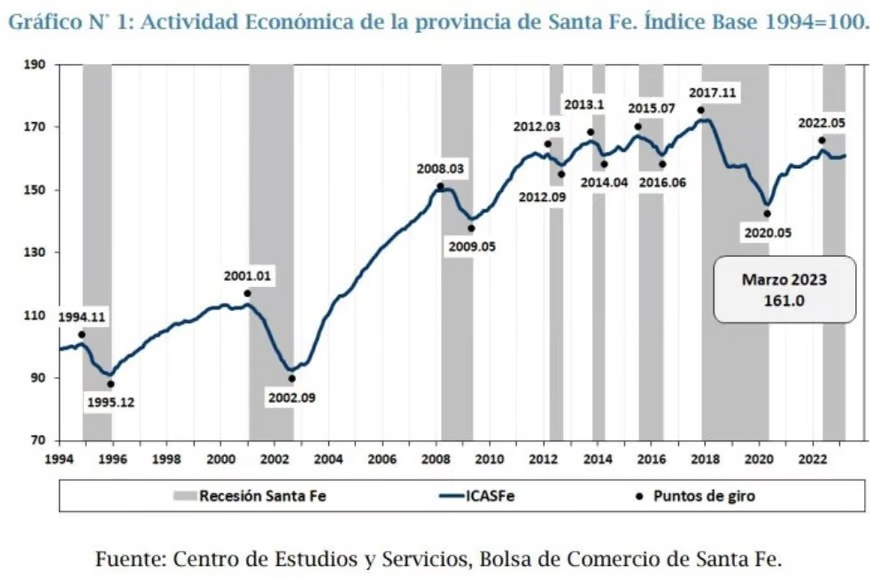 El Índice Compuesto de la Actividad Económica de Santa Fe “registró un leve incremento” de 0,3% intermensual en marzo y 0,4% respecto del mismo mes de 2021”, El Centro de Estudios y Servicios de la Bolsa de Comercio de Santa Fe advirtió que “no están dadas las condiciones para pensar en un nuevo giro de la actividad en el corto plazo”. La presente fase recesiva se inició en marzo del pasado año.