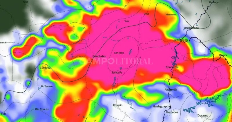 La tendencia es "bastante importante" sobre la franja central del país, especialmente en "el centro de Santa Fe, centro de Entre Ríos, que pueden llegar a tener los acumulados más importantes que se puede dar el domingo".