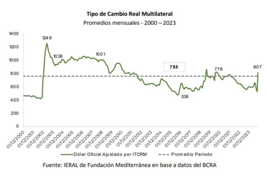 Expone el informe que "tras la fuerte devaluación de diciembre 2023, el tipo de cambio real multilateral (TCRM, el peso versus una canasta de monedas) se ubica en $807, un 7% por arriba del promedio en el período 2000 - 2023.