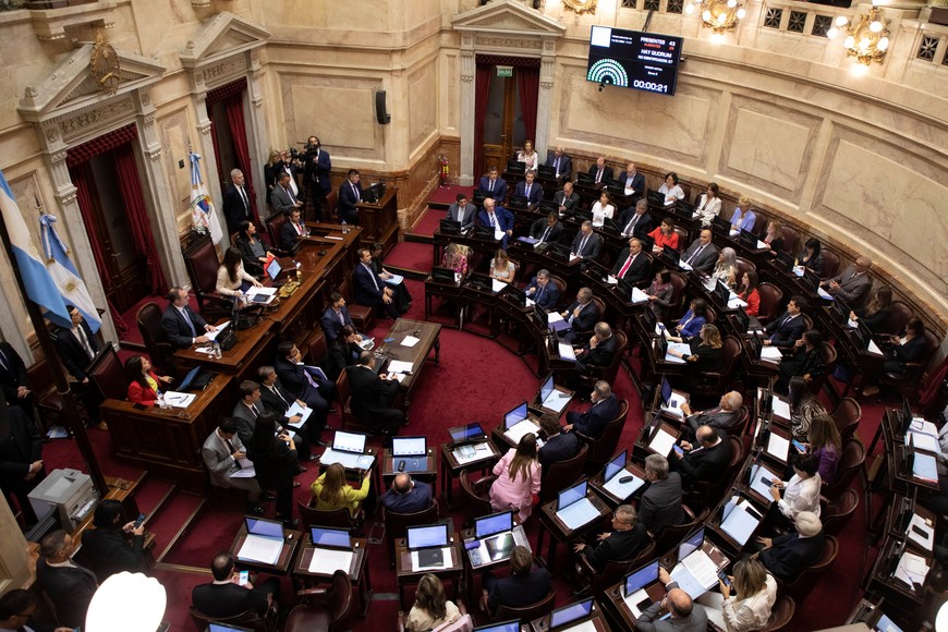 (240315) -- BUENOS AIRES, 15 marzo, 2024 (Xinhua) -- Imagen del 14 de marzo de 2024 del recinto de la Cámara de Senadores durante la sesión en la que se debate la aprobación o rechazo de un decreto de necesidad y urgencia (DNU) del presidente Javier Milei, en el Congreso Nacional, en la ciudad de Buenos Aires, capital de Argentina. El Senado de Argentina rechazó el jueves un decreto de necesidad y urgencia (DNU) del presidente Javier Milei, una norma considerada clave por el Ejecutivo por la cantidad de reformas políticas y económicas que impulsa. (Xinhua/Martín Zabala) (mz) (jg) (da) (vf)Cámara de Senadores de la Nación. Crédito: Xinhua/Martín Zabala