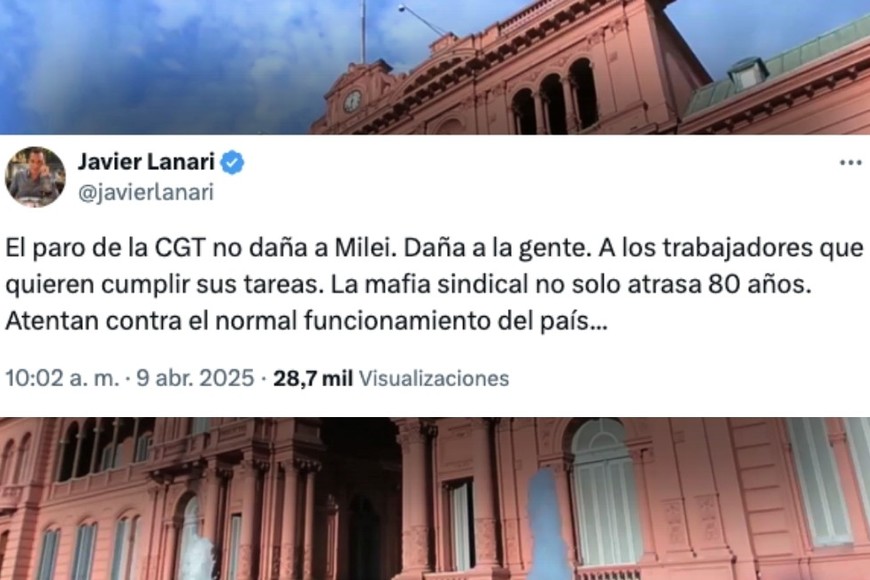 En redes, el subsecretario de Prensa, Javier Lanari, acusó a la CGT de perjudicar a los trabajadores. “El paro no daña a Milei. Daña a la gente”, escribió. El funcionario, alineado con el discurso libertario, cuestionó a “la mafia sindical” y dijo que “atentan contra el funcionamiento del país”.