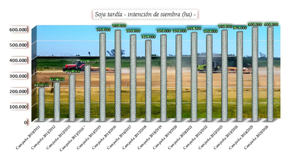 Aunque sin cambios respecto del año pasado, la superficie de soja tardía se ubico en lo más alto de la línea histórica.