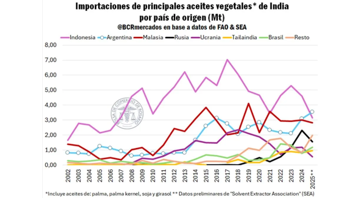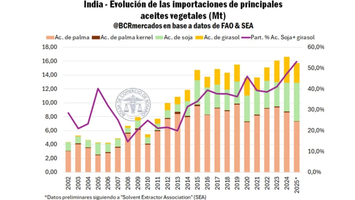 Más allá del dato puntual del récord, el cambio de fondo está en la evolución de la demanda india. En las últimas dos décadas, el país pasó de importar mayormente aceite de palma a incrementar de forma sostenida las compras de aceite de soja y girasol, que en 2025 representaron más del 53% del total importado. Solo en estos dos productos, las adquisiciones alcanzaron 8,35 millones de toneladas, casi un 50% por encima del promedio de la última década.