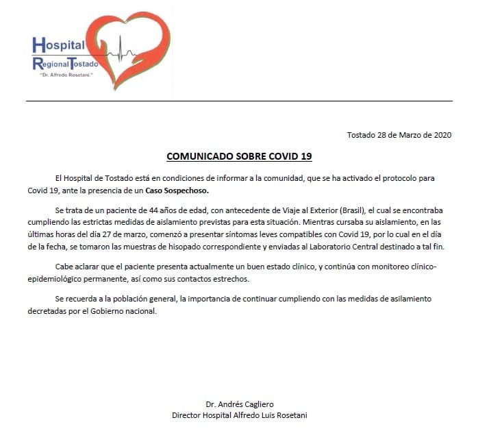 Paciente masculino de 44 años, que mantenía aislamiento estricto desde su llegada a la ciudad. por: Andres Cagliero