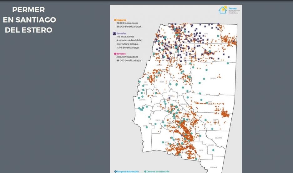Luego, detalla que “en la provincia santiagueña, el PERMER está ejecutando obras en 22 mil hogares (88 mil beneficiarios) por más de U$S 5,2 millones; 145 escuelas (11.745 beneficiarios) por U$S 6,3 millones; y se instalaron 543 boyeros solares por más de U$S 380 mil, que beneficiaron a más de 2100 productores. Además, hay dos convocatorias abiertas para realizar instalaciones en 173 centros de atención primaria de la salud (14.013 beneficiarios) por U$S 5,2 millones, y 5 equipamientos para Parques Nacionales por U$S 289 mil”.