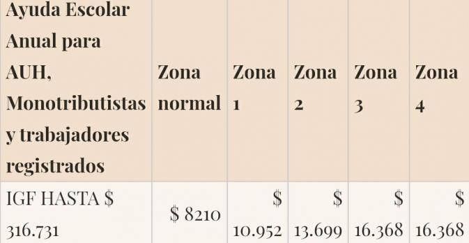 Es una asignación de pago único que se abona automáticamente por cada hijo en edad escolar que haya presentado el certificado de escolaridad hasta el 31 de diciembre inclusive, y se encuentren dentro de los cuatro a 16 años que asistan en los niveles jardín, preescolar, primaria y secundaria.