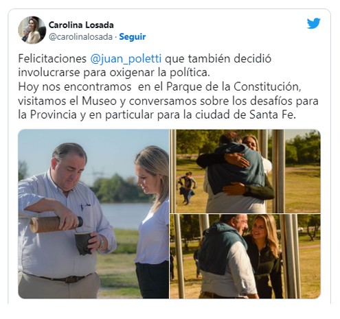 Hubo cena con dirigentes radicales que trabajaron con ella en la campaña anterior y lo estarán en la que se avecina pero también hubo una reunión con Juan Pablo Poletti, el doctor ya en modo candidato a intendente. "Felicitaciones @juan_poletti que también decidió involucrarse para oxigenar la política. Hoy nos encontramos en el Parque de la Constitución, visitamos el Museo y conversamos sobre los desafíos para la Provincia y en particular para la ciudad de Santa Fe", escribió en redes sociales la senadora al concluir la jornada.