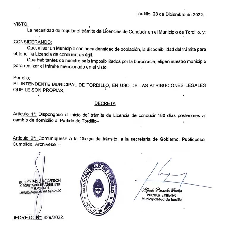El jefe comunal interino -que reemplaza a Héctor Olivera, quien pasó a desempeñarse como presidente de la Autoridad del Agua (ADA) bonaerense- envió a este medio el decreto municipal del 28 de diciembre del año pasado, con su firma. En los fundamentos, se menciona que “habitantes del país imposibilitados por la burocracia”, eligen el municipio para realizar el trámite, ya por su “poca densidad de población, la disponibilidad del trámite para obtener la Licencia de conducir, es ágil”.