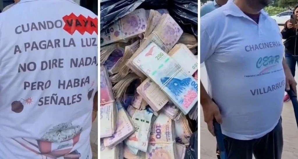 “No tengo un maletín para traer tanta plata así que la traigo en carretilla”, dijo el protagonista de este hecho aludiendo a la cantidad de dinero que debe pagar para mantener su local. Según se alcanza a ver en el video del momento, la plata estaba adentro de una bolsa de consorcio, dividida en fajos. “Voy a pagar la luz que me vino en el negocio: $840 mil pesos”, recalcó agobiado por la situación.