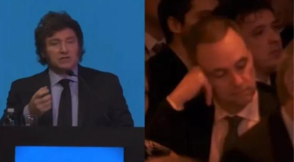El portavoz presidencial fue captado por las cámaras durmiendo mientras el mandatario nacional exponía en la cena anual de la Fundación Libertad