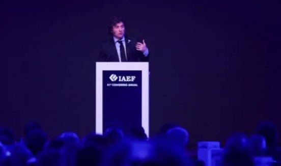 También aludió brevemente al conflicto diplomático con España: "Hay un personaje que me encanta que es El Zorro. ¿De qué trataba la trama del Zorro? Tenía dos tipos de enemigos. Obviamente a Monasterio y todos sus soldados, o sea, el Estado que venía y le sacaba los recursos para llevárselo a España. Bueno, justo hoy menciono a España. Igual ya lo tengo a match point a Pedrito. Pese a lo que diga la progresía mediática", enfatizó ante las risas de los ejecutivos de finanzas que seguían su mensaje en el centro de convenciones.