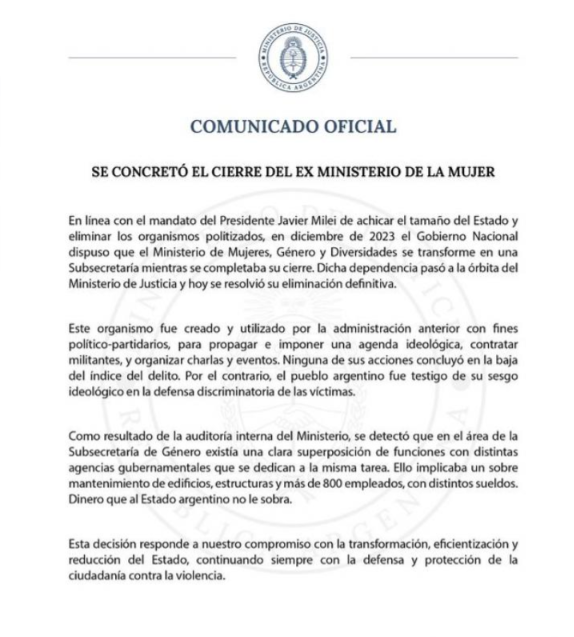 Luego de reducir su función a Subsecretaría el oficialismo confirmó a través de un comunicado la eliminación del Ministerio de Mujeres, Géneros y Diversidades de forma permanente. "Este organismo fue creado y utilizado por la administración anterior con fines político-partidarios para propagar e imponer una agenda ideológica" argumentó el Ministerio de Justicia.
