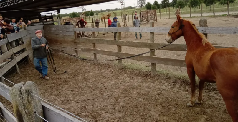Después de las explicaciones teóricas, se realizaron clases prácticas en el corral con caballos problemáticos. El Sr. Hardoy explicó que "el éxito del trabajo radica en la paciencia y el buen trato hacia el caballo". Los asistentes quedaron sorprendidos al ver cómo, tras 50 minutos de trabajo paciente, un alazán tostado conocido por su comportamiento problemático salió con el bozal puesto.