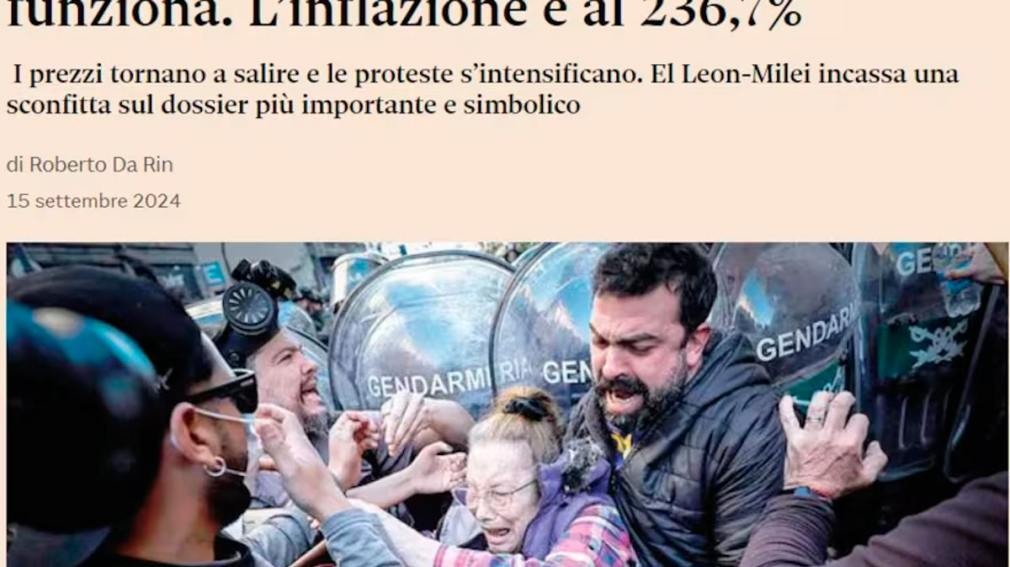 Al comentar la salida del dato de inflación de agosto del 4,2% respecto del mes anterior, superando las previsiones de los analistas, Il Sole 24 Ore se hace eco de “las nuevas dudas sobre la fuerza de Milei” aparecidas en diversos medios de todo el mundo, que van desde el Wall Street Journal y el Financial Times a El País. “El rugido del León parece ya mucho más ronco”, asegura el diario, que estima que, más allá de las promesas electorales de derrotar la inflación, en base a los precios al consumidor, la inflación de los últimos 12 meses fue del 236,7%, el nivel más alto del mundo y superior también a las previsiones del sondeo de Reuters del 235,8%. “Los analistas habían previsto un +3,9% y en cambio la batalla campal de Milei en contra de la inflación cosecha una derrota pesada, también sobre el plano de la imagen”, asegura.