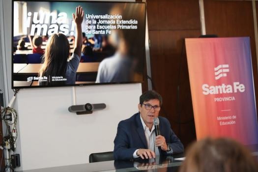 Durante una conferencia de prensa realizada en el Ministerio de Educación, en la ciudad de Santa Fe, el titular de la cartera, José Goity, presentó el grado de avance en “la implementación de una hora más de aprendizaje, una hora más de los niños en la escuela primaria”, y manifestó su satisfacción “por el nivel de aceptación y adhesión que ha tenido en el conjunto de los docentes esta propuesta, ya que la opción tanto para la familia como para los docentes era de carácter optativo. Queremos agradecer, felicitar y expresar nuestro reconocimiento y alegría por el nivel de adhesión que ha tenido esta propuesta”.