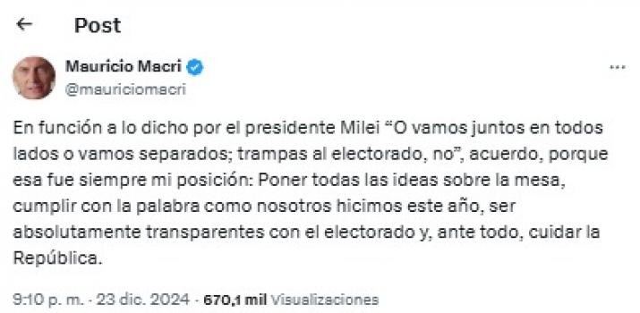 "En función a lo dicho por el presidente Milei “O vamos juntos en todos lados o vamos separados; trampas al electorado, no”, acuerdo, porque esa fue siempre mi posición: Poner todas las ideas sobre la mesa, cumplir con la palabra como nosotros hicimos este año, ser absolutamente transparentes con el electorado y, ante todo, cuidar la República", escribió el presidente del PRO.