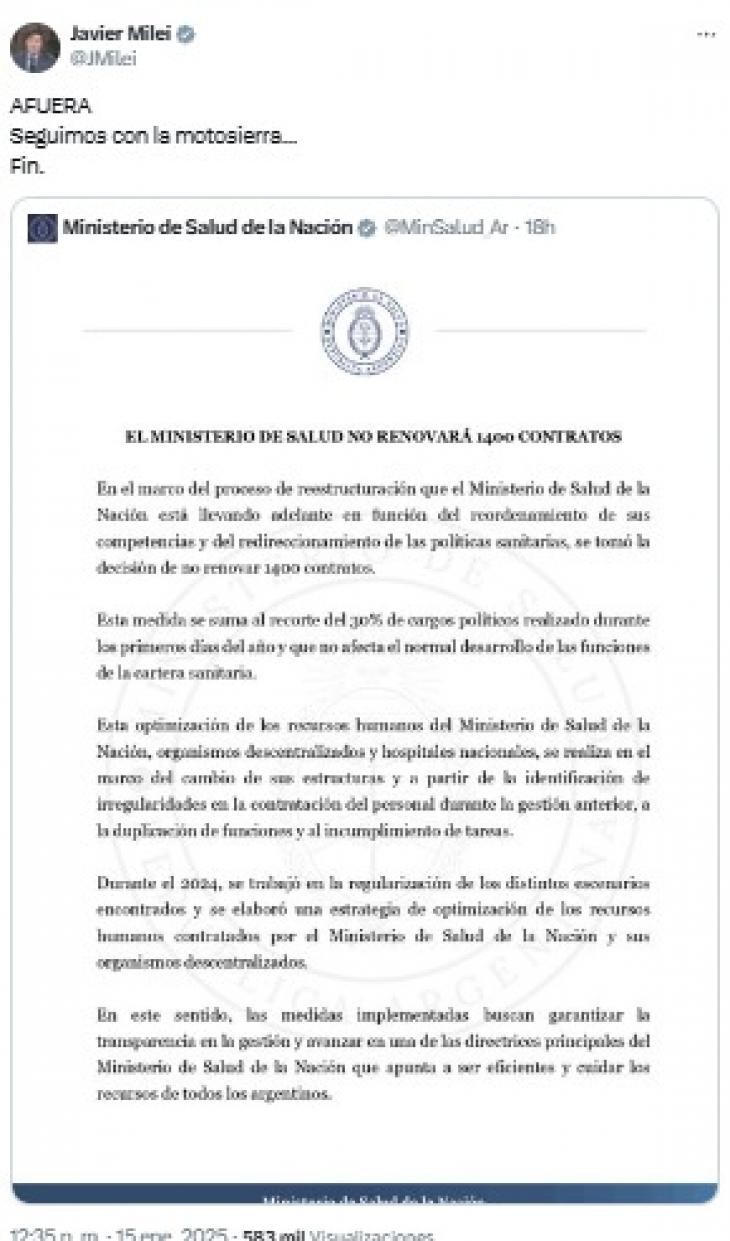 Minutos después, el presidente Milei escribió un mensaje en la red social X aludiendo al comunicado de Salud: "AFUERA. Seguimos con la motosierra... Fin.".