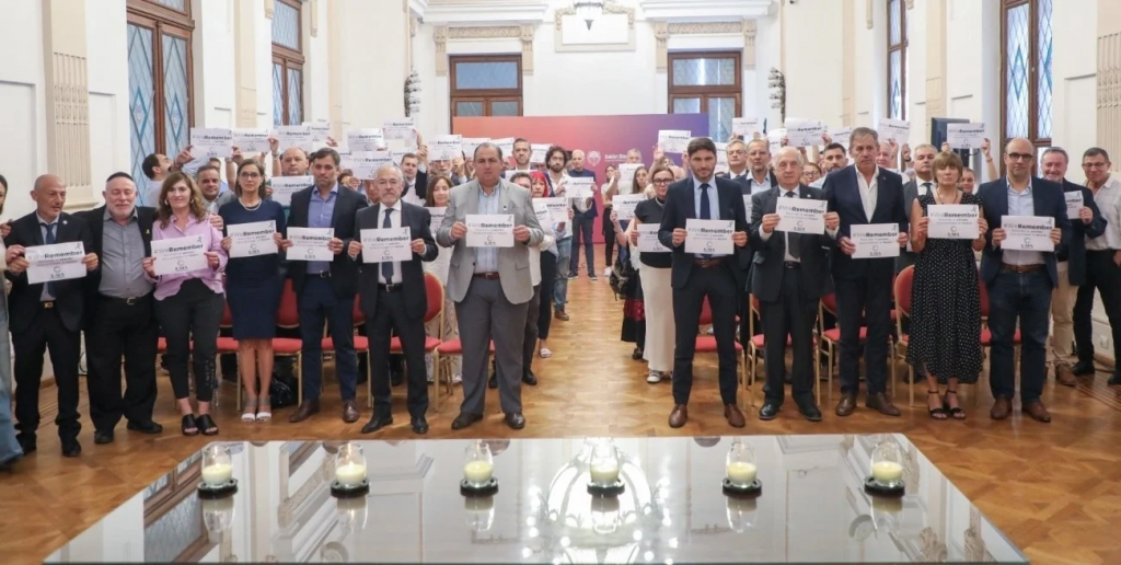 Un video ilustrativo sobre la fecha, el encendido de seis velas por las víctimas y la oración de un rabino antecedieron a los discursos de Roitman; el secretario de Derechos Humanos, Emilio Jatón; el intendente, Juan Pablo Poletti y el de Pullaro.