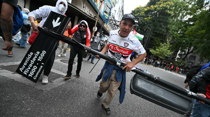 Un manifestante porta un poste durante una protesta de jubilados apoyados por hinchadas frente al Congreso
