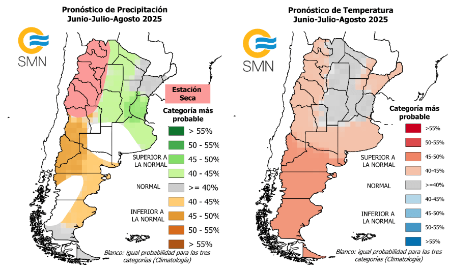 En la mayoría de las zonas agrícolas de Argentina, el pronóstico trimestral del SMN muestra un escenario de lluvias que superarán el promedio histórico. Las temperaturas, también entre normales y altas.