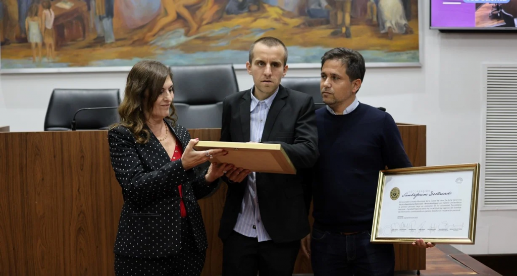 En el Concejo Municipal se vivía el lunes por la tarde un momento emotivo que se hacía sentir en los aplausos. Bruno Rodríguez, acompañado por su mamá y su hermano, recibió la declaración de Santafesino Destacado por parte del cuerpo deliberante de la ciudad. Es el reconocimiento a un logro importante: convertirse en la primera persona ciega en graduarse como Ingeniero en Sistemas de Información en la Universidad Tecnológica Nacional (UTN), Facultad Regional Santa Fe.