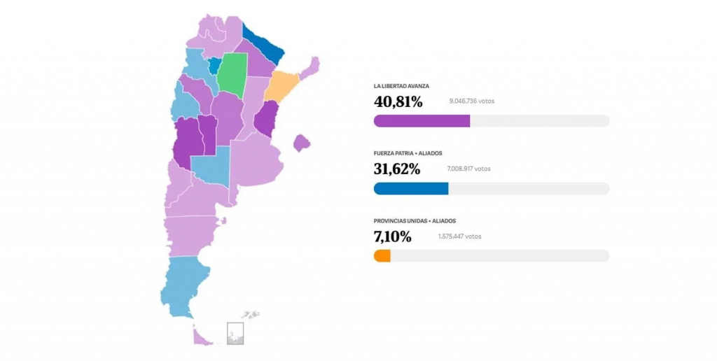 Con el 94,78% de las mesas escrutadas el mapa de Argentina vuelve a pintarse de lila, color representativo de La Libertad Avanza, el espacio creado y liderado por Javier Milei y su hermana, Karina.