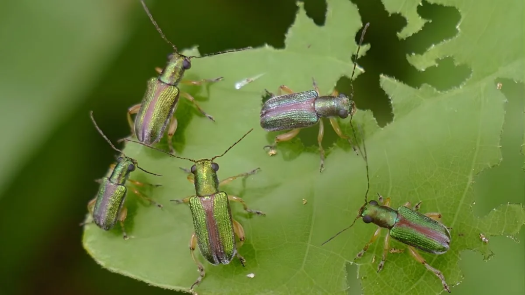 La vaquita defoliadora es un coleóptero de unos 5 milímetros, de color verde metálico, muy activo y de hábitos gregarios.