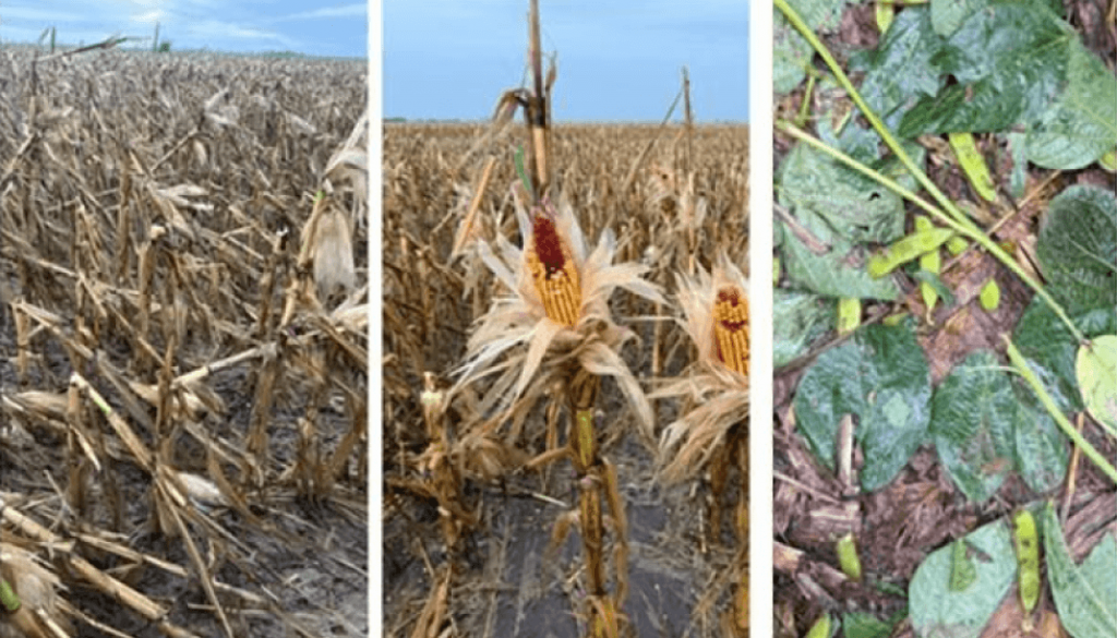 Según el relevamiento, en los lotes de soja se observan caída de vainas y fuerte deshojado; mientras que en los de maíz hay desgrane y pérdidas de espigas y quebrado. En los casos más severos, el granizo directamente “barrió” los lotes